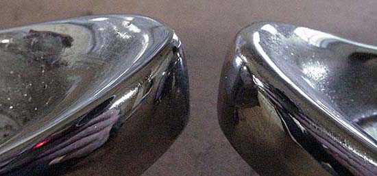 Closer views of the upper sections of the housings show the crisper edge on the left piece (driver side) and the rounded edge on the right piece (passenger side).