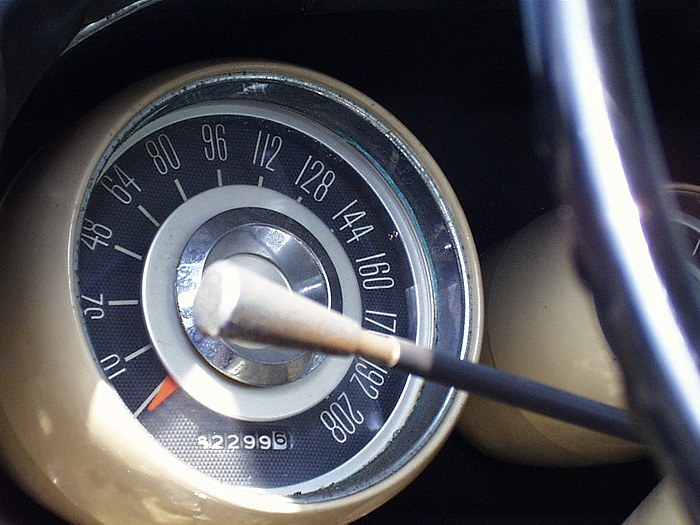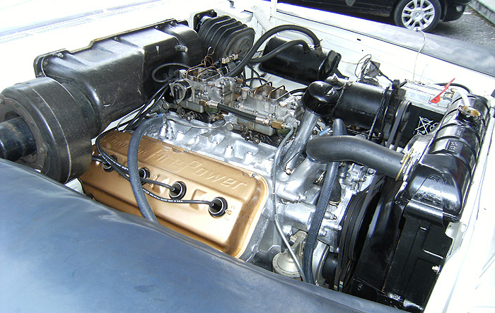 The dash had a small crack, but I decided to leave as-is, preferring original to repro parts. The engine was apart but mostly complete, still standard bore and crank. The cam was missing and now an Iskenderian cam gives life to the engine. The transmission was in good condition; it does not even leak. The chrome was redone of course, but the stainless was just polished. Seats, dash, steering wheel, headliner, door panels are all original and in very good shape. On Ebay I found some wire wheels, so they were mounted in place of the original wheels and hubcaps. Grill only needed to be cleaned, and I bought some emblems from the Club.