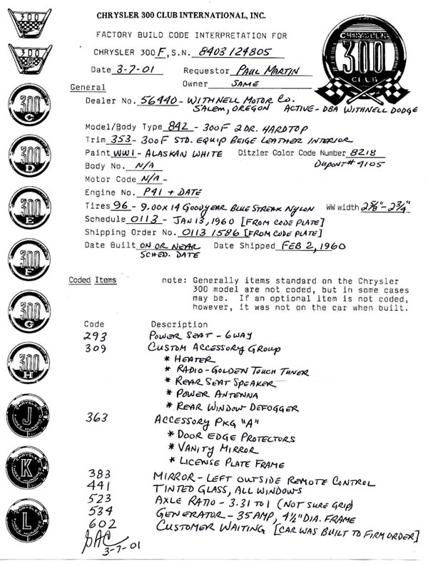 Shortly after purchasing my 300F I began the quest to track its history. The person whom I bought it from only knew about the four previous years of ownership. Among the documents with the car was some correspondence from the 300 club about the car being registered in the clubs database. A pair of Oregon Plates with expiry tags of 1979 were in the trunk. I was not certain if these plates with the number AY 1887 had any relevance to my car.