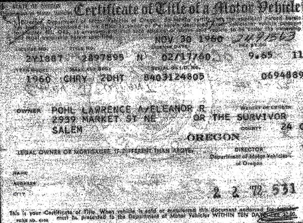 I called Jan a few days later and she confirmed she had the info back and it contained photocopies of 4 Oregon titles including the original title from February 1960. The original title showed the first plate on the car as AY 1887. Pay dirt!!. I had the packaged couriered to me and when it arrived the next day I was in heaven as I poured over the data.