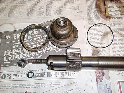 Collar removed showing lock nut for thrust bearing. If I was just re-sealing this box, everything would come out together to keep all the parts in line.