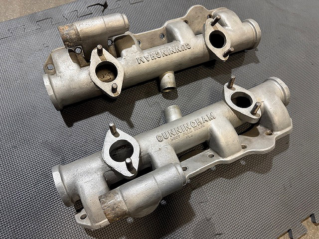 Chuck Schoendorf writes: Here is a photo of original Cunningham log intakes that they cast in aluminum in the early 50’s for both the race cars and the street cars. They were fitted with four Zenith one barrels. Besides more power they saved 30 lbs. of weight in the nose versus the stock cast iron manifold.