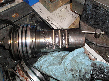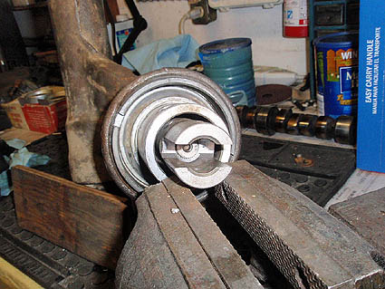 Clamped in the vice to remove the thrust bearing lock nut. The nut is already loosened here.