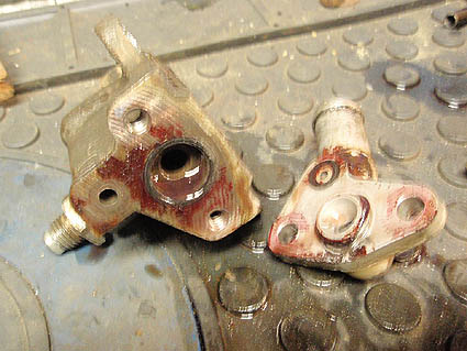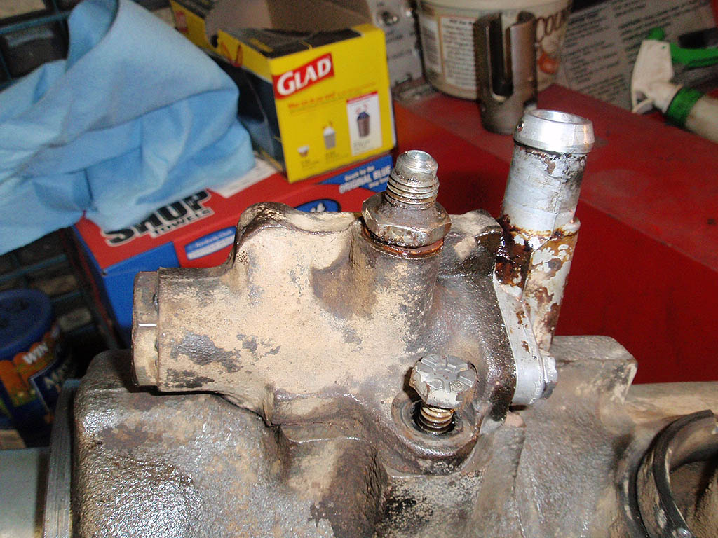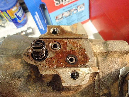 Top of steering box with valve body removed. Notice the O-rings. They are usually the source of leaks. Mark the valve body before removing, or the car may self steer to the left or right.