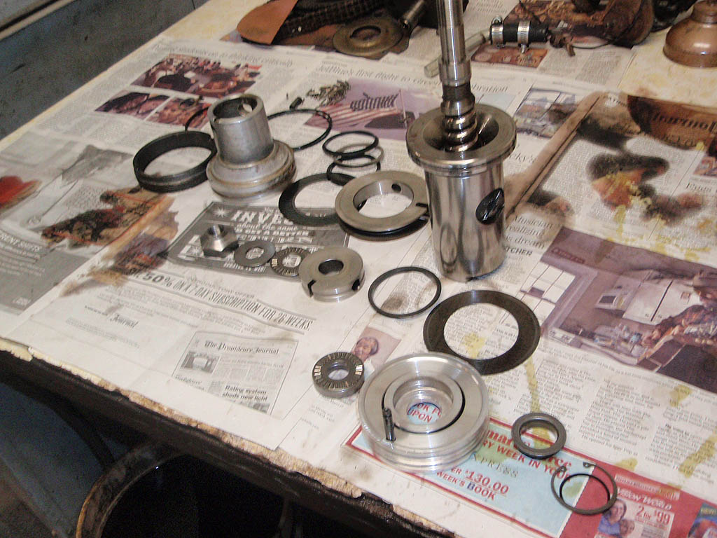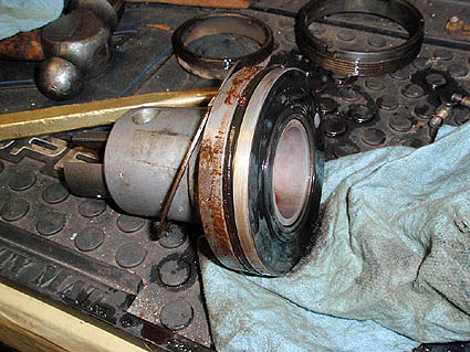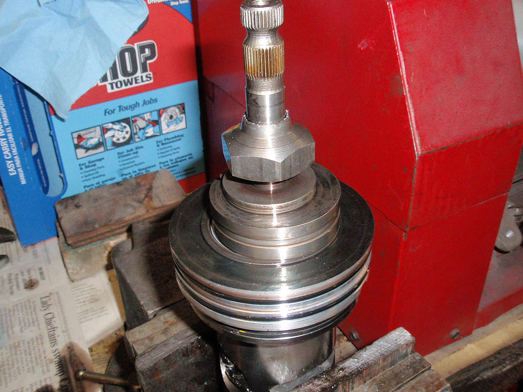 Collar removed showing lock nut for thrust bearing. If I was just re-sealing this box, everything would come out together to keep all the parts in line.