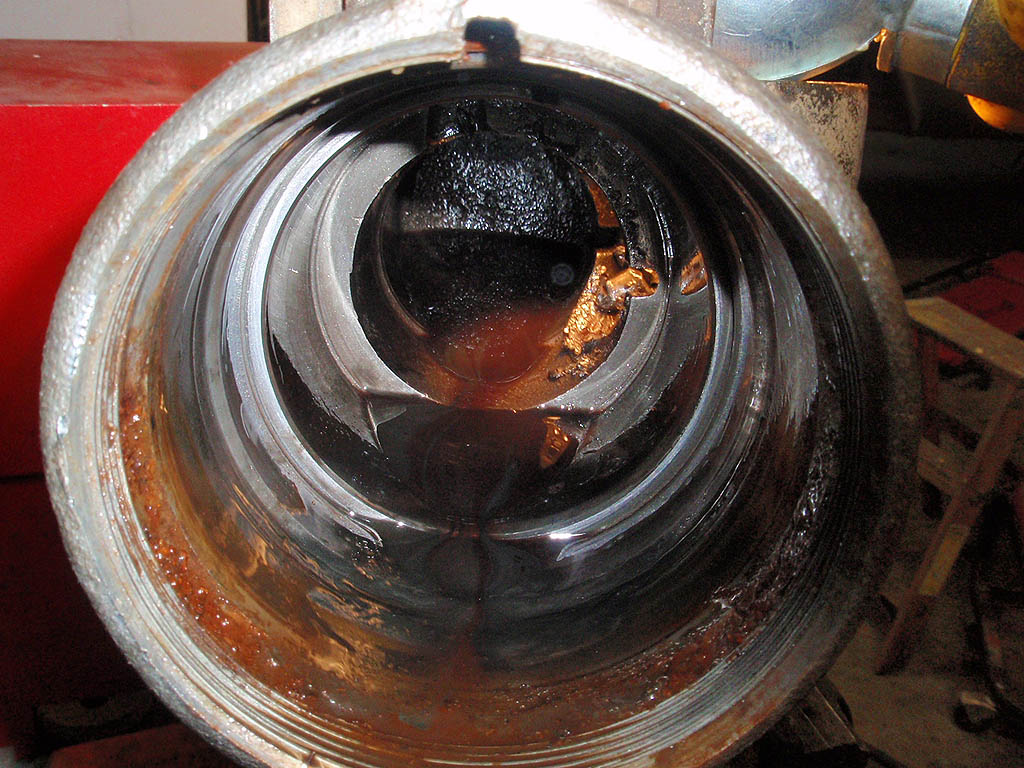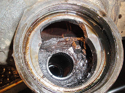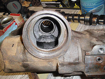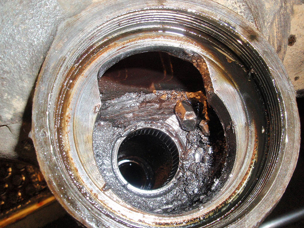 The view down in the housing showing the broken bits of gear teeth and the wear into the housing.
