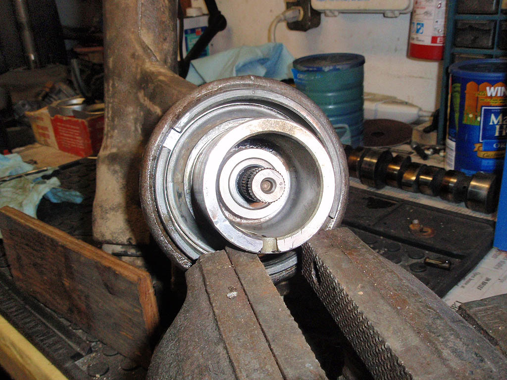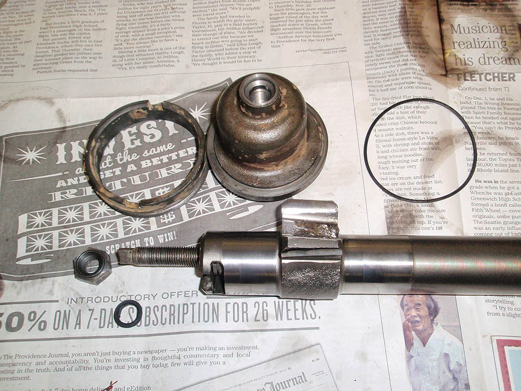 The steering shaft end of the box. The coupler is just there to center the sector shaft so it could be removed. The nut has been removed and the collar is ready to come out.