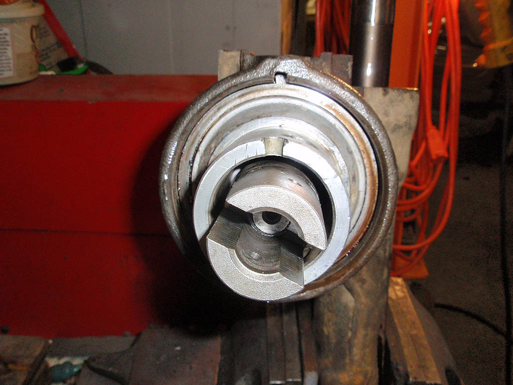 Shows the coupling removed. You can see the punch mark on the shaft on the right, and 2 more on the collar nut and housing.